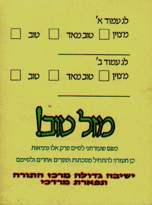 A method I have been using to get the talmidim motivated to review I have a bulletin board beautifully decorated with all the talmidims names on it. as well as all the blatt gemarah in our perek. If a boy is tested on an amud gemarah a circle is placed on his name on that blatt, after he is tested on the next amud which is an entire blatt a star is placed there in its place. The stars and circles are also color coded. Red is Metzuyan, blue is Tov Meod and yellow is Tov.