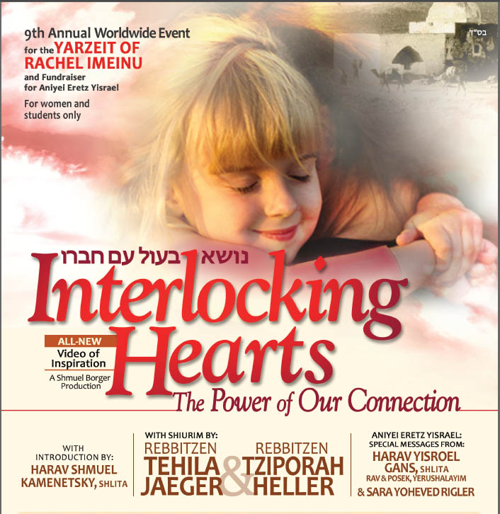 9th annual Worldwide Yarzeit of Rachel Imeinu video YARZEIT RACHEL IMEINU VIDEO with ALL NEW MATERIAL for 2011-- worldwide event --Most communities are showing the video on Monday, Nov. 7th IY"H but some are showing it later. Rebbitzen Tzipora Heller and Rebbitzen Tehila Jaeger are the featured speakers on this year's Yarzeit Rachel Imeinu video, entitled "INTERLOCKING HEARTS: THE POWER OF OUR CONNECTION". The introduction is by HaRav Shmuel Kamenetsky. It concludes with a special message about Aniyei Eretz Yisrael from Rav Yisroel Ganz, Rav and Posek, Yerushalayim, and words from Sara Yoheved Rigler. This worldwide event will take place with showings of the video in communities around the globe. To order the video, email the name of your community to keytfilla@gmail.com .