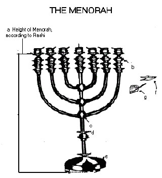 ANSWERS TO QUESTIONS ON PARASHAT TERUMATHE ARON HAKODESH - (THE HOLY ARK IN THE TABERNACLE) (a) Golden ark cover (b) Golden rings to attach the staves to the main structure (c) Cherubim (d) Golden crown surrounding the ark cover (e) Staves - permanently attached to the ark THE SHULCHAN (TABLE IN THE TABERNACLE) (a) Mold for the show bread (b) Shelving tubes - to bear the weight of the individual loaves of show bread (c) Golden crown - around the border of the table (d) Rings - to attach the staves to the main structure (e) Staves - to carry the table (f) Boards (vertically placed) - forming the structure for the show bread (g) Spoon for frankincense offering THE MENORAH (CANDELABRUM IN THE TABERNACLE) (a) The height of the Menorah according to Rashi (25:35) is eighteen handbreadths - about 1.45 meters. Features of the Menorah: (b) Decorative cup (c) Decorative knob (d) Decorative flower (e) Base of the Menorah (f) Tongs - accessory to the Menorah, to prepare the wicks (g) Firepan - accessory to the Menorah, to clean the ashes from the lamps THE MIZBEIACH - OUTER MAIN ALTAR. (a) Horns of the altar (b) Staves - to carry the altar, which was hollow in structure (c) Rings - to attach the staves to the main structure (d) Base of the altar (e) Copper netting - a decorative feature (f) Border carved into the altar wall - a decorative feature